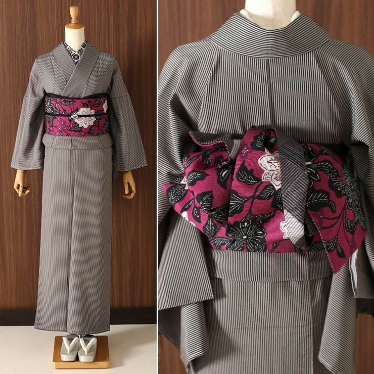 | 帯地に工夫を凝らし、他にはない味わいのある染帯に。 染帯は通常、縦糸横糸ともに白色で織り、それから染めていきます。しかし、こちらの帯は横糸に黒色を部分的に混ぜ、白黒をミックスさせたグレー地に。そこに染をすることによって、こっくりとした深みのある色彩を実現しました。 |