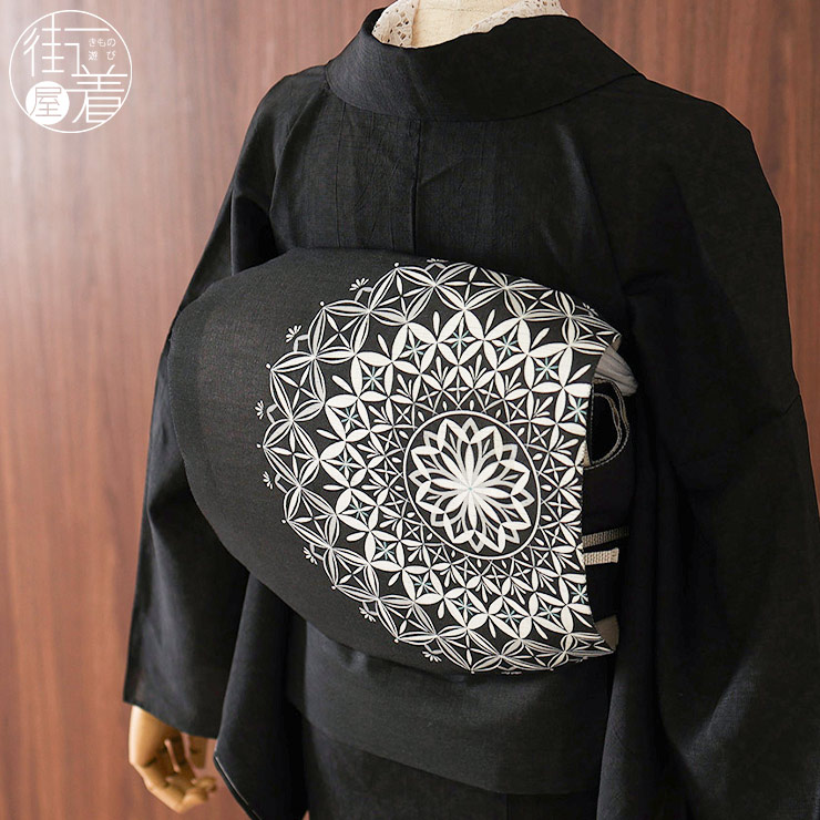 | 美しい柄行と上品な麻の質感 おしゃれな夏の京袋帯 「召しませ花」 麻・京袋帯 <切子レース> 黒/麻色 一重太鼓 京袋なごや帯 日本製 |