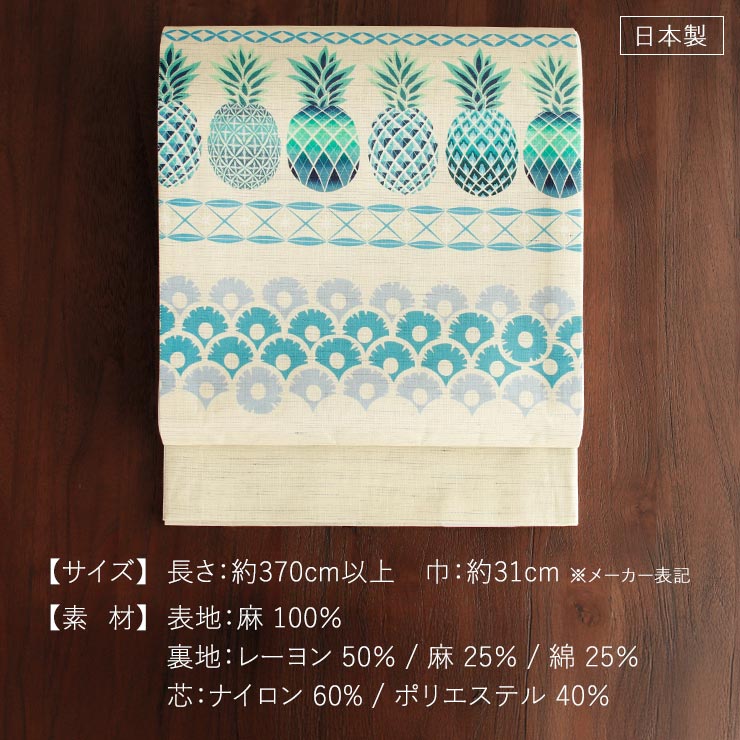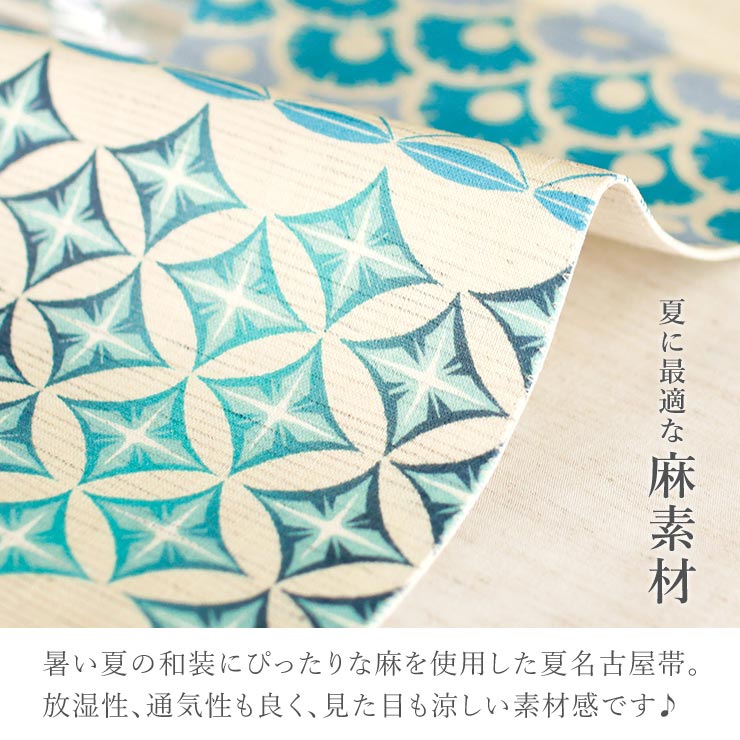 天然素材の麻を使用しており、蒸し暑い季節でもまとわりつかない肌ざわりの良さと爽やかな見た目の素材感は夏にピッタリの帯です。