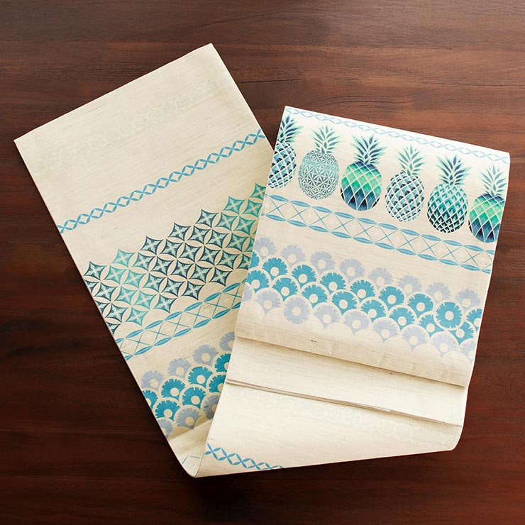 | “ひんやり涼やかなパインはいかが?” おしゃれな夏の京袋帯 「召しませ花」 京袋 麻・なごや帯 <パイナップル> 麻色/ブルー 素敵なデザインに着物が着たい!と思わせてくれる、大人気「召しませ花」の京袋帯シリーズ。 あなたのきものライフをより楽しくする素敵な1本です。 一重太鼓 夏用 京袋なごや帯 麻使用 日本製 |