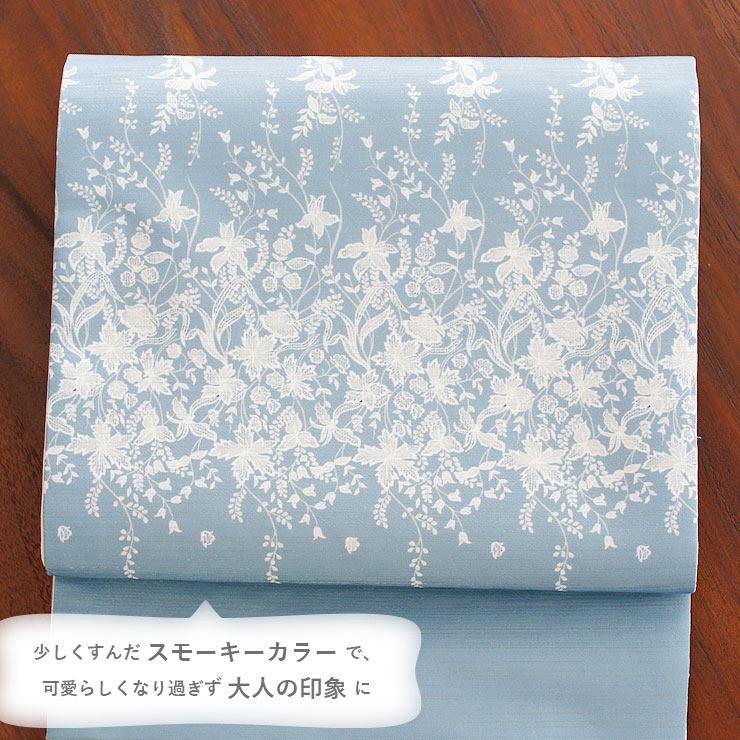 光沢糸を織り込んだ華やかなブルー地に、可憐で繊細な小花柄。地色が少しくすんだスモーキーカラーなので、可愛らしくなりすぎず大人の印象に。遠目にも美しく、思わず近くでその繊細な柄行を眺めたくなるデザインです。