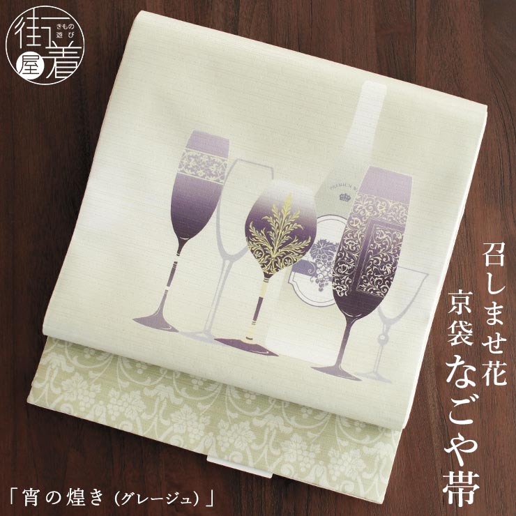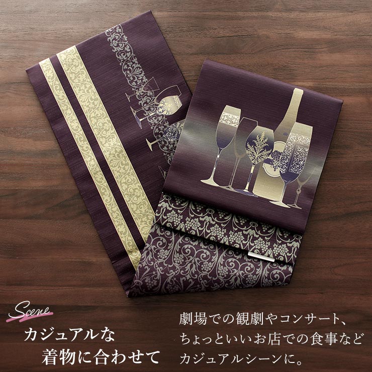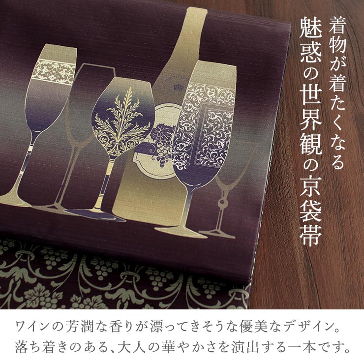 ワイングラスとボトルのシルエットが大人の華やかさを感じさせる、個性的なデザインが魅力的な袋帯です。