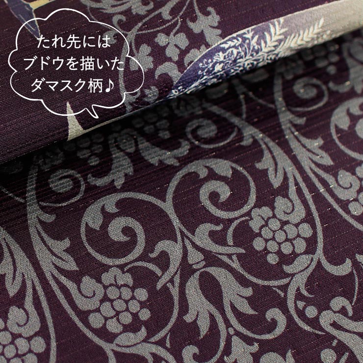 また、たれ先にはブドウモチーフのダマスク柄が描かれていて、結んだときのアクセントになります。