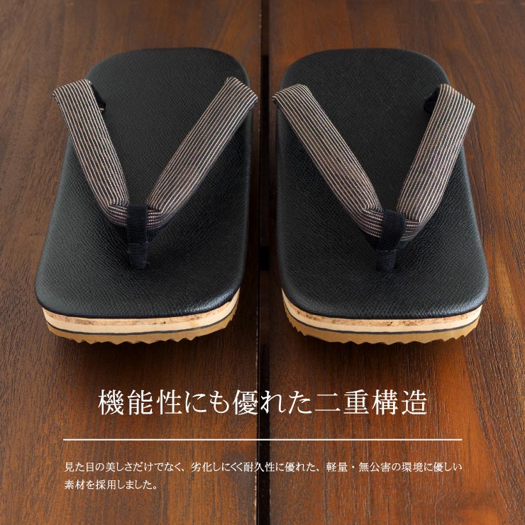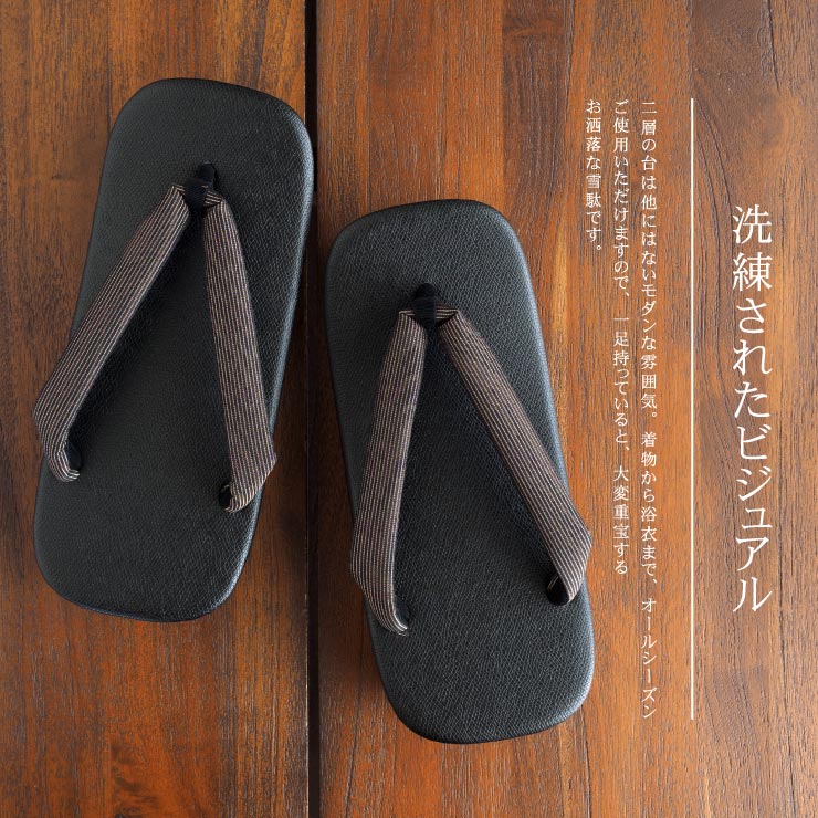 二層の台は他にはないモダンな雰囲気。着物から浴衣まで、オールシーズンご使用いただけますので、一足持っていると、大変重宝するお洒落な雪駄です。 |