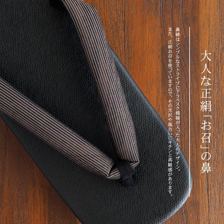 鼻緒はシンプルなストライプにアラベスク模様が入った大人のデザイン。また、正絹お召を使っていますので、その光沢や風合いにキチンと高級感があります。 |