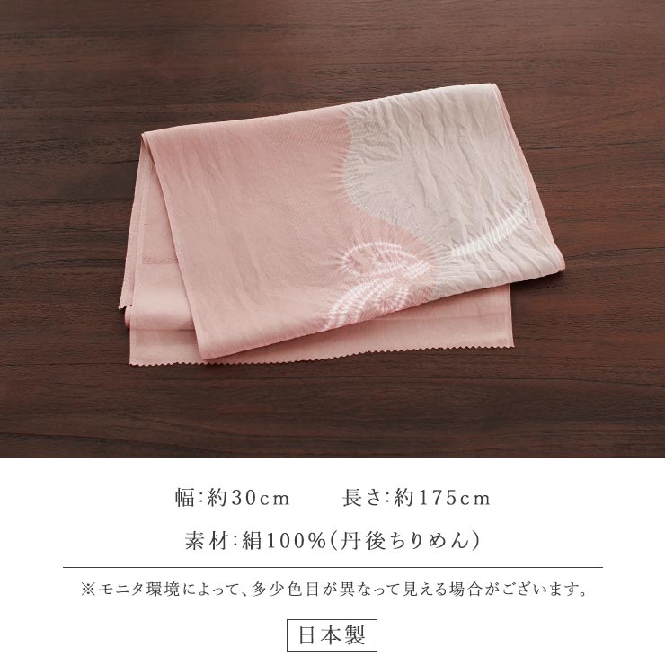 | 「丹後ちりめん」ならではの正絹の風合い 絞り染めが美しく目を引く帯揚げですが、生地にもそれに負けない存在感と、高級感のある正絹の丹後ちりめんを使用しています。 |