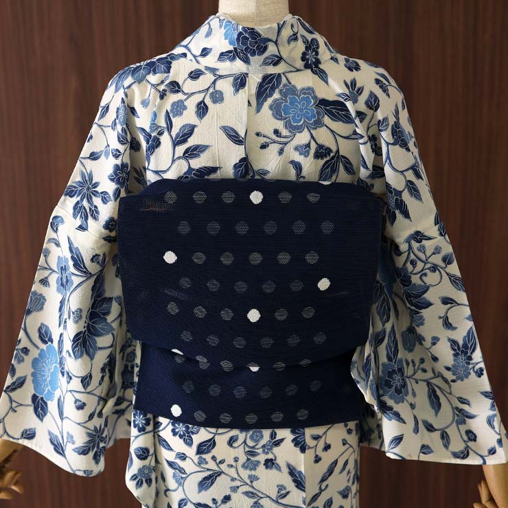 流行に左右されない月華美人の着物は、何度着ても飽きがこない柄裄。半巾帯でラフに着こなせば浴衣として、名古屋帯でカッチリと着こなせば夏着物としてお楽しみ頂け、着物愛好家の方や大人女性の方に発表以来、長年親しみ好まれている夏の着物です。