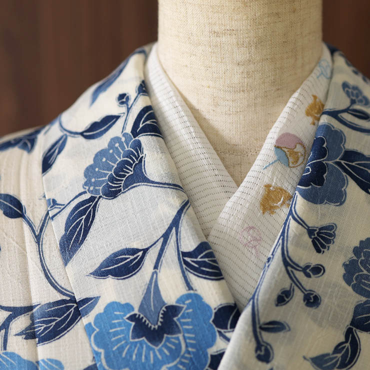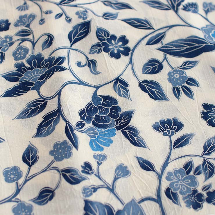 オフシロ地に、青色の更紗のデザイン。落ち着きのある清楚な色目です。シンプルな中にも存在感があり、生地のシワ加工と相まって、さらに味のある風合いに。ぜひ自分らしいコーディネートをたくさん見つけてくださいね。