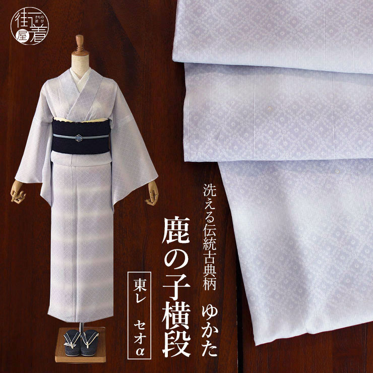 伝統的な鹿の子が七宝状に並んだ細かなデザイン。また、上品なグレーと優しい藤色の横縞が大人っぽく、しっとりとした雰囲気に遊び心と愛らしさが合わさった、魅力的な柄行です。さらにシワ加工を施した生地に合わせることで、味のある風合いに。ぜひ自分らしいコーディネートをたくさん見つけてくださいね。