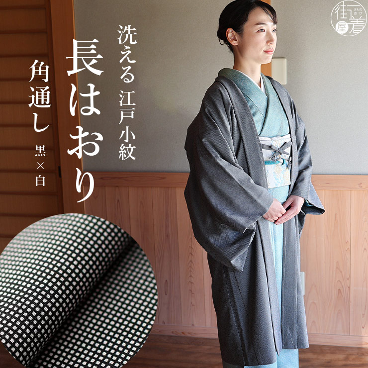 | 上品な江戸小紋柄で、一段上の装い 東レ素材の “洗える” 長羽織 <東レ T.S.システム縫製> オリジナル 長羽織 江戸小紋 - 角通し - (黒×白) 日本製 ちりよけや体型カバーにも |