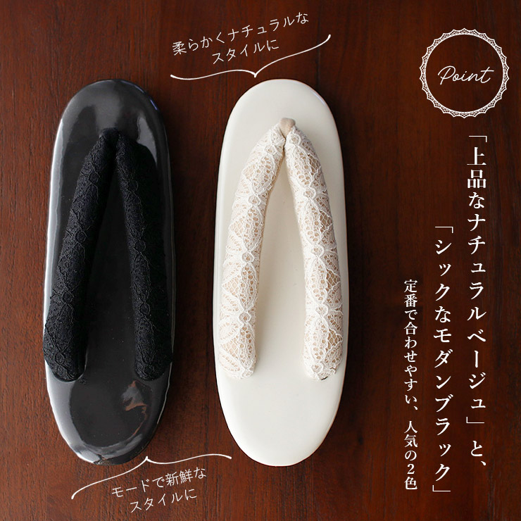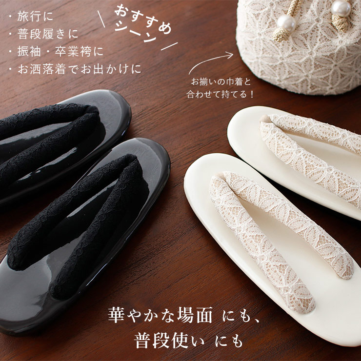 ウレタンソールを採用した軽やかな履き心地で、雨の日でも安心してお使いいただけます。普段使いはもちろん、旅行やおでかけ、卒業式や振袖イベントなど幅広いシーンにおすすめの一足。シンプルで上品な色使いと、美しいレース鼻緒が特徴で、色無地や小紋・振袖・卒業袴など、さまざまな装いに合わせて活躍します。