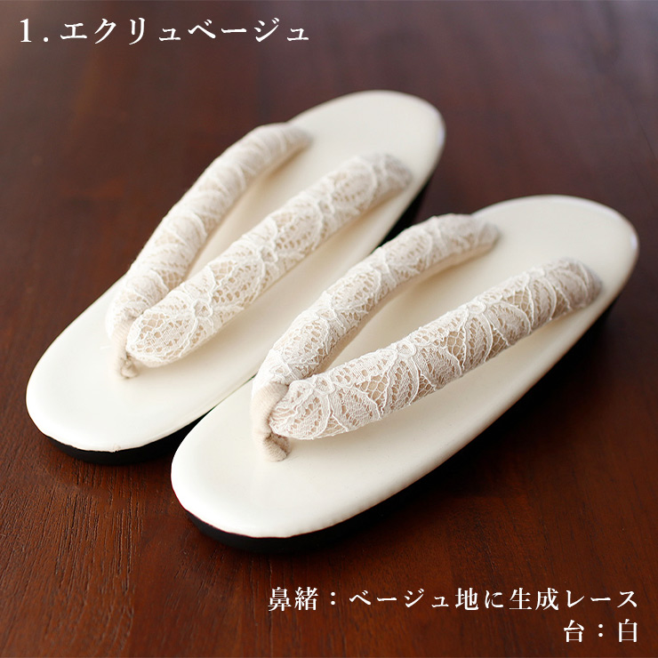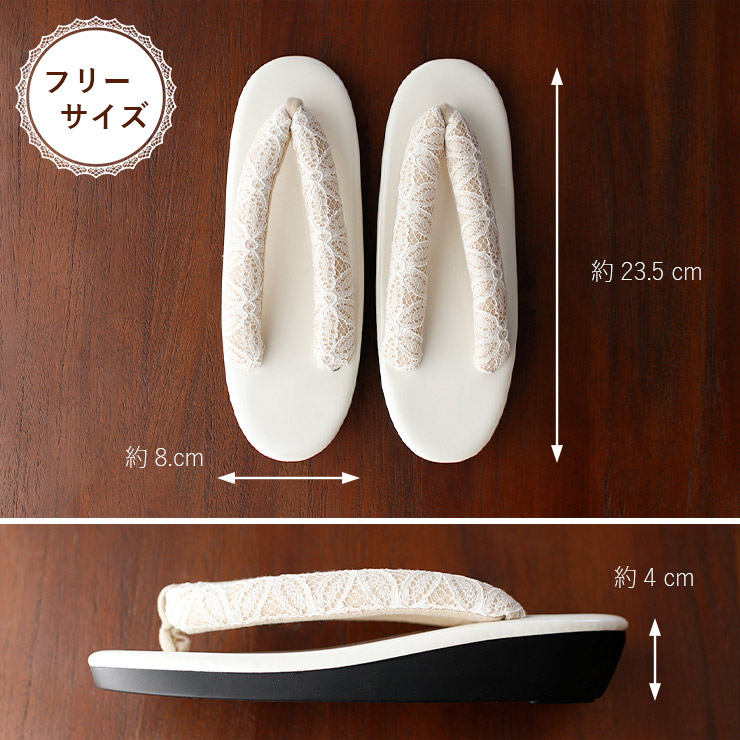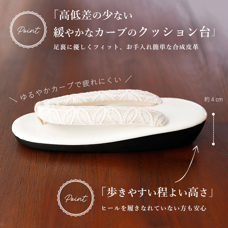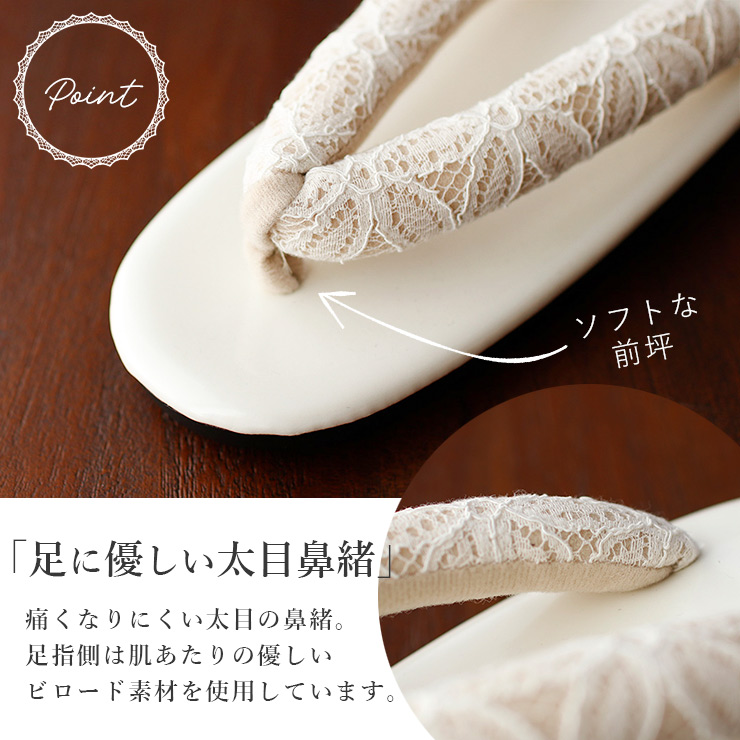 シンプルな台に、鼻緒は幾何学的なフラワーレースデザイン。繊細なレースが足元を華やかに彩り、上品でさりげないアクセントを添えます。