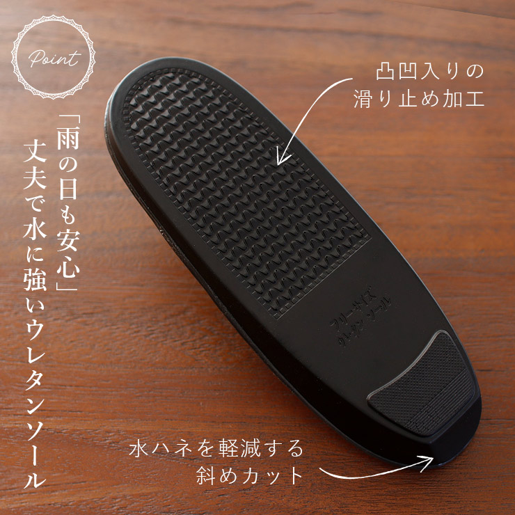 耐水性のあるウレタン素材には滑り止め効果の溝が入っているので、雨の日や急な悪天候でも安心です。かかとに入ったカットには雨や泥などの「はね返り防止」効果があり、足袋や着物を汚れから守ります。
