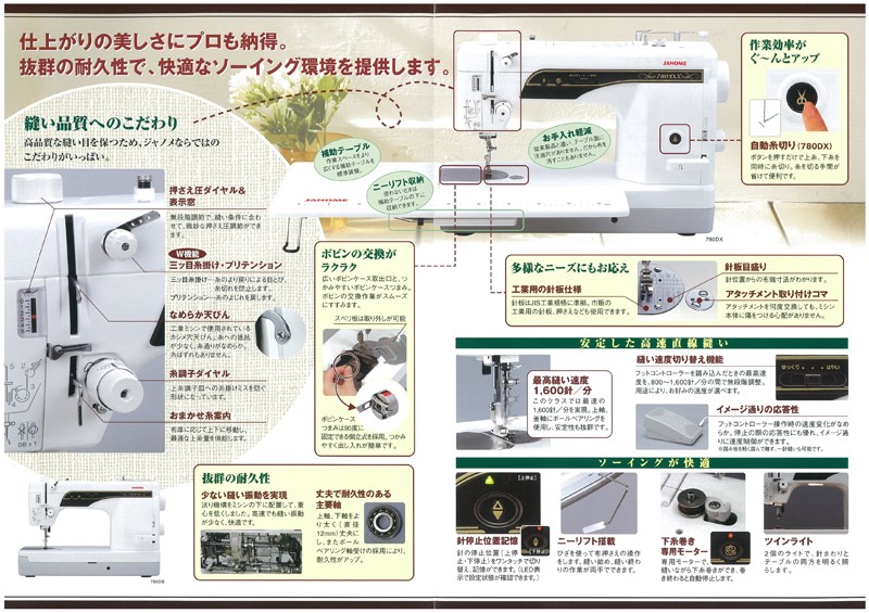 最大5年保証付き ミシン 本体 ジャノメ 職業用ミシン 780DX 四つ折りバインダー押え・レザー押え・ファスナー押え・コンシールファスナー押えプレゼント中
