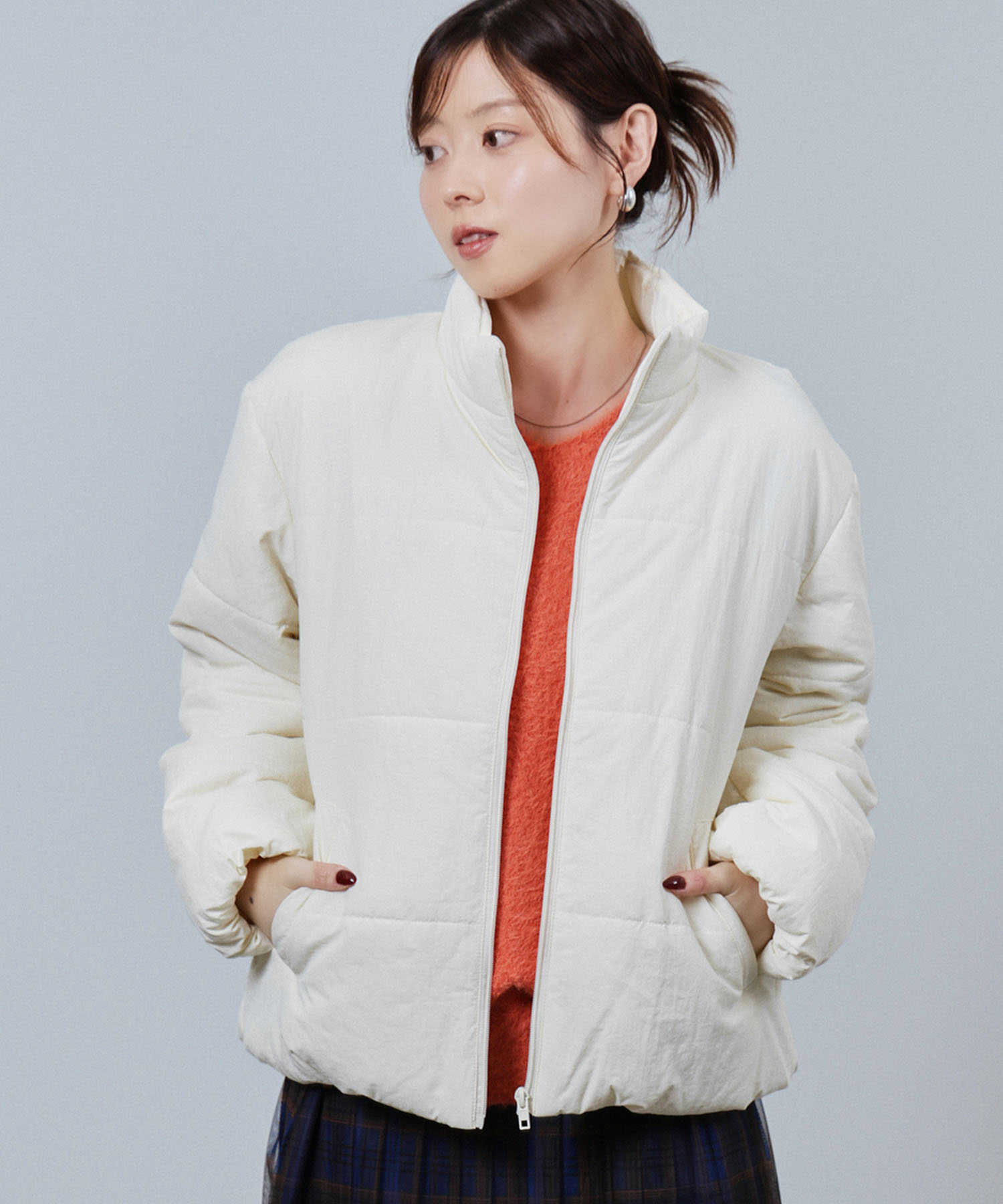 | 暖かく軽い、中綿スタンドネックブルゾン。 カラーは、オフホワイト・チャコール・ブラック・ブルー・モカの5色展開です。 ■デザイン スタンドネックとすっきりとした丈感で何にでも着合わせしやすい万能デザインです。 ■ポイント 表面感のあるナイロン素材を使用しております。 はっ水機能付きで汚れにくく、ちょっとした雨や雪でも安心◎ ■コーディネート 腰周りくらいの丈感なので、ストレートやワイドパンツを合わせるとスタイリッシュな印象に。 ※ご覧になられているモニター環境や端末により色の見え方に違いがございますので、ご了承ください。 ※商品梱包用の透明ビニール袋に「タグ付け時に発生する切り込み」がある場合がございます。 サステナブルな取り組みへの観点から、袋の入れ替えを行わない事にご協力をお願い致します。 ■素材 表地:ナイロン100%、 裏地:ポリエステル100%、 中綿:ポリエステル100% ■洗濯方法 洗濯機/ネット使用 ■生産国 中国