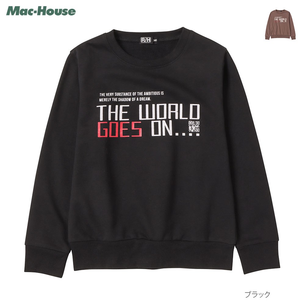 | 【マックハウス限定独占販売】 フロントロゴがかっこいい裏起毛トレーナーです。 バックにもさりげないプリントが入ったこだわりのデザイン。 カラーは、ブラック・ブラウンの2色展開。 合わせやすく着回しやすいレギュラー丈です。 デニムやスウェットパンツなどと合わせていただけます。 通園・通学やスポーツシーンにも最適な一枚です。 ※ご覧になられているモニター環境や端末により色の見え方に違いがございますので、ご了承ください。 ■素材 表地:ポリエステル65%、綿35%、 リブ部分:ポリエステル63%、綿34%、ポリウレタン3% ■洗濯方法 洗濯機/ネット使用 ■生産国 バングラデシュ