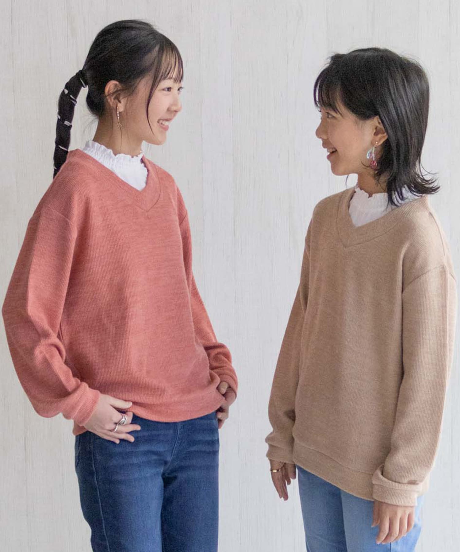 | フリル襟とVネックニットを合わせたようなレイヤード風のキッズニットソーです。 裏毛生地を使用し、長いシーズン着用できます。 カラーは、ピンク・ベージュの2色展開です。 ■デザイン 襟元をブラウスのような異素材で仕上げたフェイクレイヤードスタイル。 一枚で簡単に重ね着風スタイルが完成します。 ■ポイント 暖かみのあるニットソー素材を使用。 通園・通学からお出かけまで活躍度の高いアイテムです。 ■コーディネート スカートを合わせたガーリースタイルはもちろん、 デニムやスキニーパンツを合わせたカジュアルスタイルもおすすめ。 兄弟やお友達同士でのお揃いコーデもおすすめです♪ ※ご覧になられているモニター環境や端末により色の見え方に違いがございますので、ご了承ください。 ※商品梱包用の透明ビニール袋に「タグ付け時に発生する切り込み」がある場合がございます。 サステナブルな取り組みへの観点から、袋の入れ替えを行わない事にご協力をお願い致します。 ■素材 本体:ポリエステル95%、ポリウレタン5%、 別布部分:ポリエステル65%、綿35% ■洗濯方法 洗濯機/ネット使用 ■生産国 中国