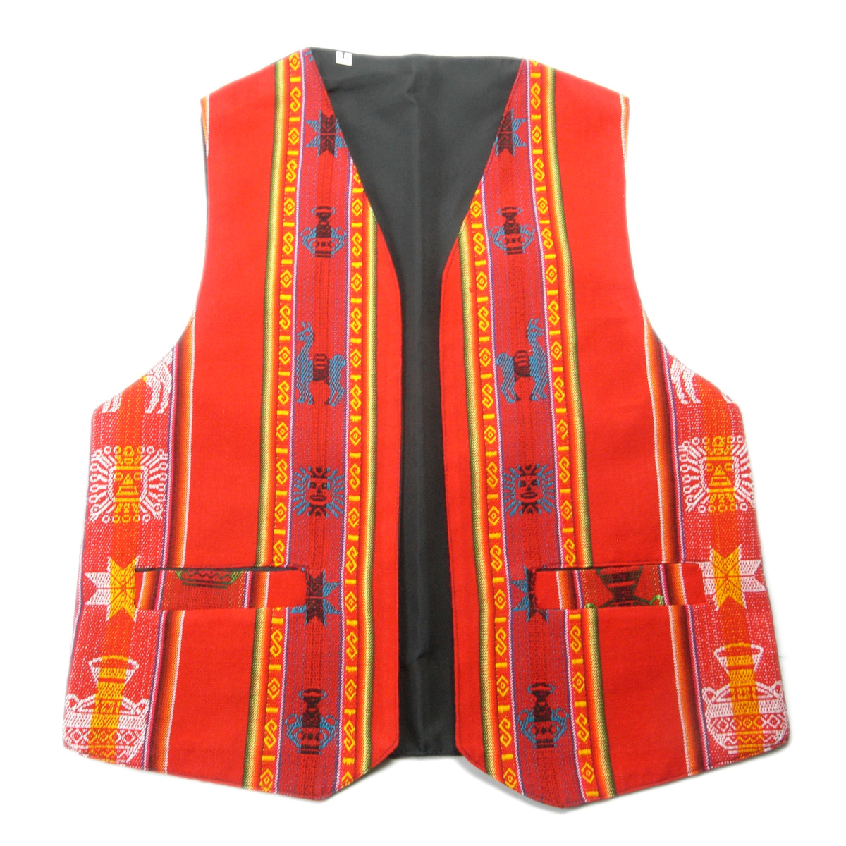 色鮮やかなアンデス柄の布地を表地に仕立てた、ボリビア製チャレコです。演奏会などのステージ衣装としても手軽に着用でき、華やかな印象を演出します。掲載写真の実物をそのままお届けしますので、イメージ違いの心配もありません。