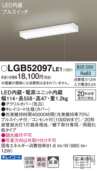 LGB52097 LE1 パナソニック LED キッチンライト 直管20形 昼白色 法人様限定販売 LGB52097LE1