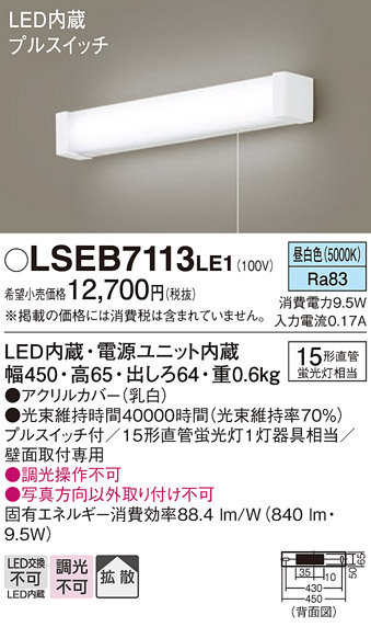 在庫あり LSEB7113LE1 パナソニック キッチンライト 流し元灯 壁面取付専用タイプ プルスイッチ付 相当品 LGB85045LE1 [ LSEB7113 LE1 ]