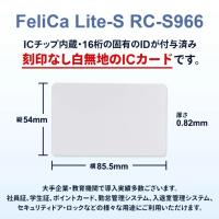 【 製品仕様 】 型番:Lite-S RC-S966 FeliCaチップ 寸法:85.5×54×0.82mm 材質:プラスチック 重量:約5g 通信:FeliCa 通信方式, NFC(ISO18092)Passive mode に準拠 チップ名称:FeliCa Lite-S チップメーカー:ソニー株式会社 通信距離:5cm チップID番号:16桁 システムコード:未設定 サービスコード:未設定 NDEF仕様:未フォーマット他、 社員証、学生証、ポイントカード、勤怠管理システム、入退室管理システム、セキュリティドア・ロックなどの様々な用途にご利用いただいてます。