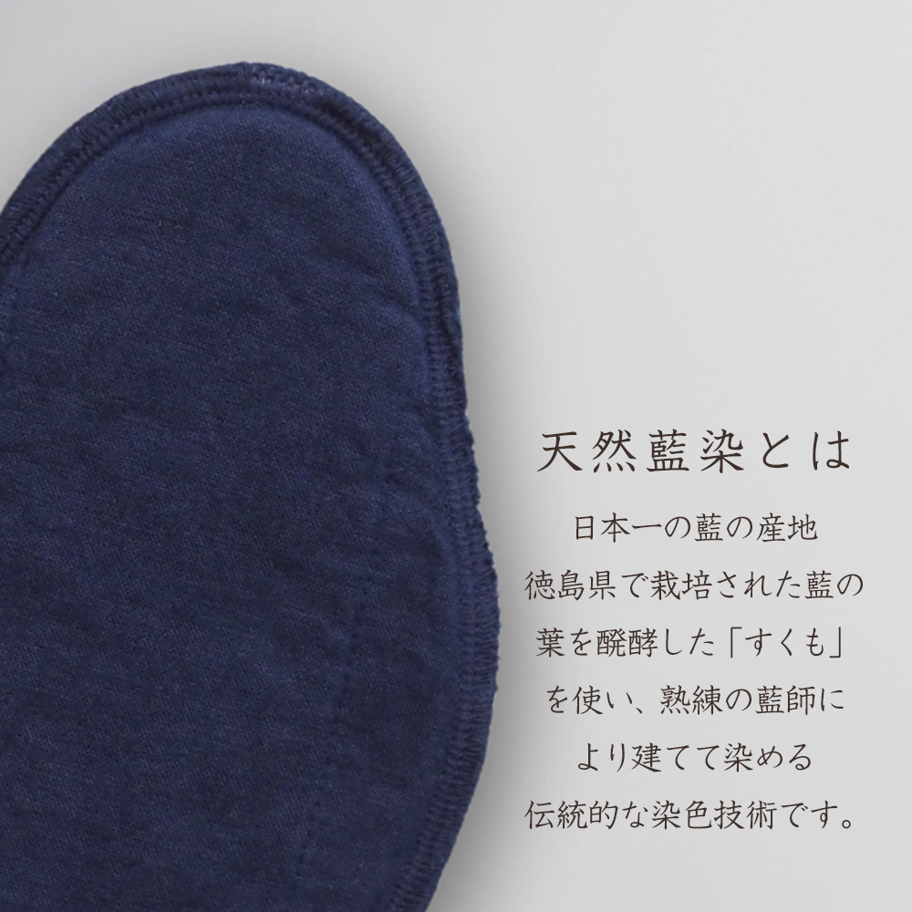 藍は、昔より殺菌、防虫、消臭、冷え、保温紫外線防止などに使われてきたと言われています。魅力あふれる藍の色合い、純オーガニックコットンのやさしい風合いとのハーモニーで、心地よい毎日を過ごしましょう。