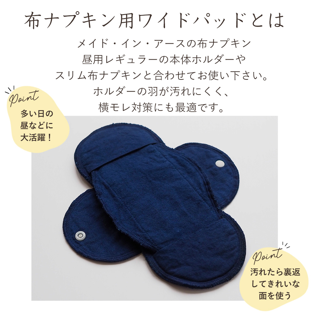 メイドインアースの布ナプキン本体ホルダーとセットでお使いいただくための替え用パッドです。ワイドタイプなのでホルダーの羽が汚れにくく、横モレ対策にも最適です。多い日はレギュラーパッドと2枚重ねもおすすめです。