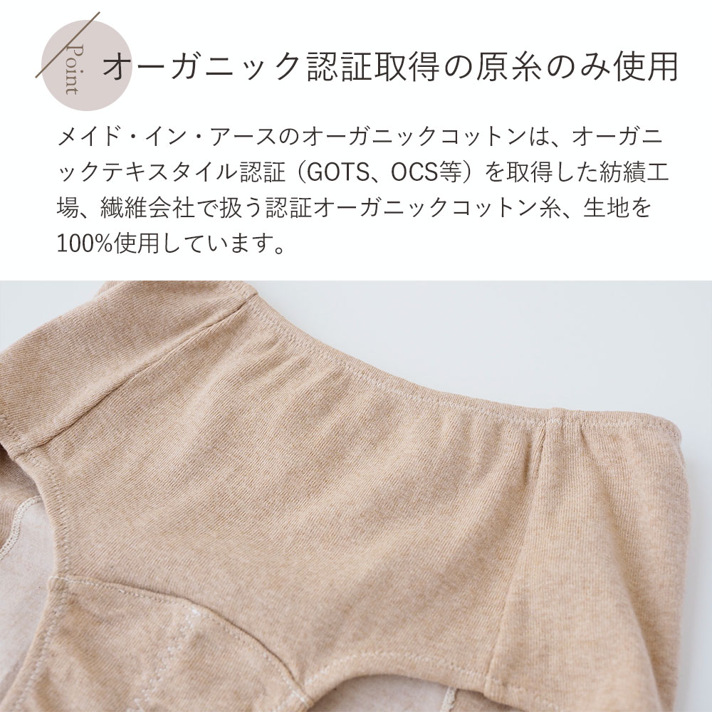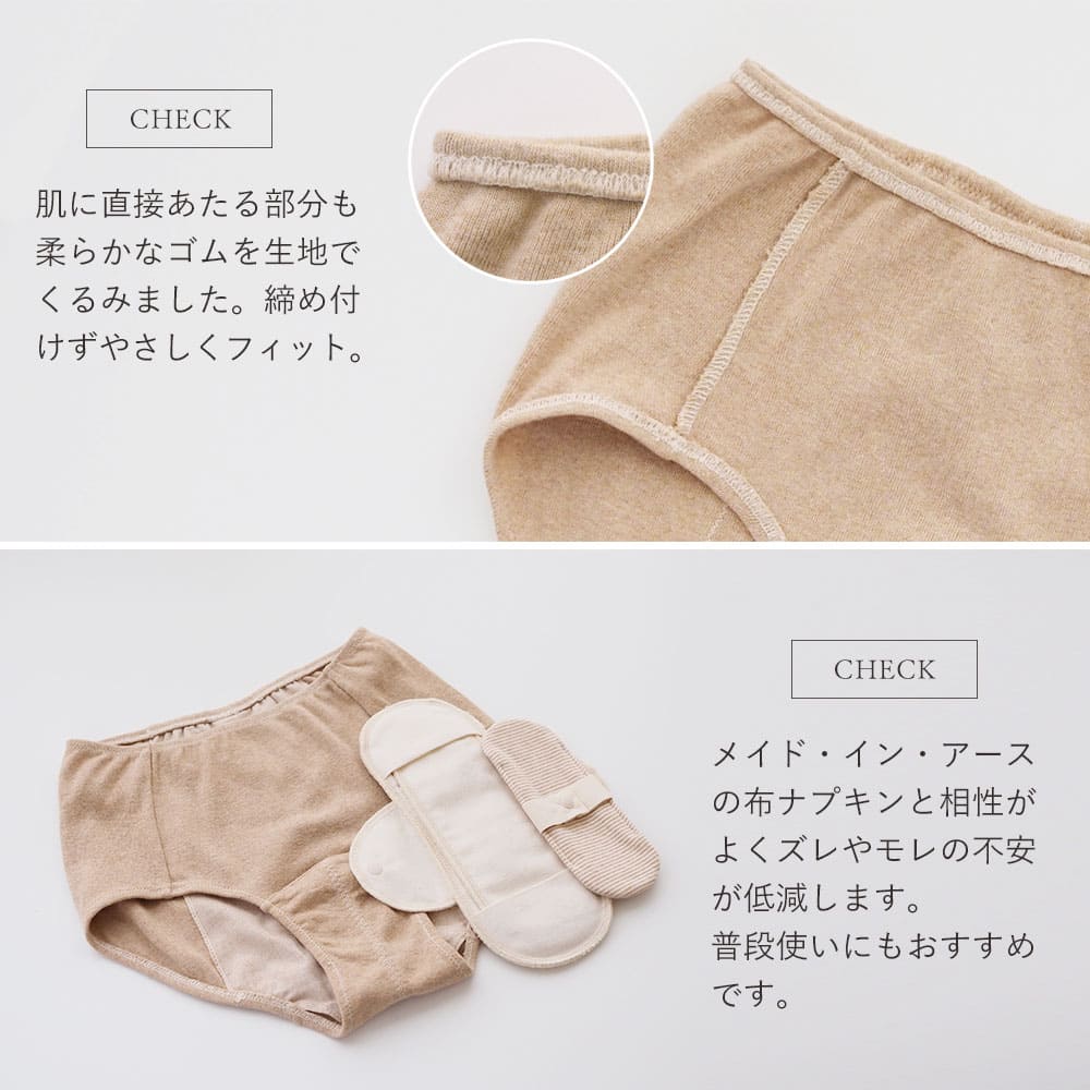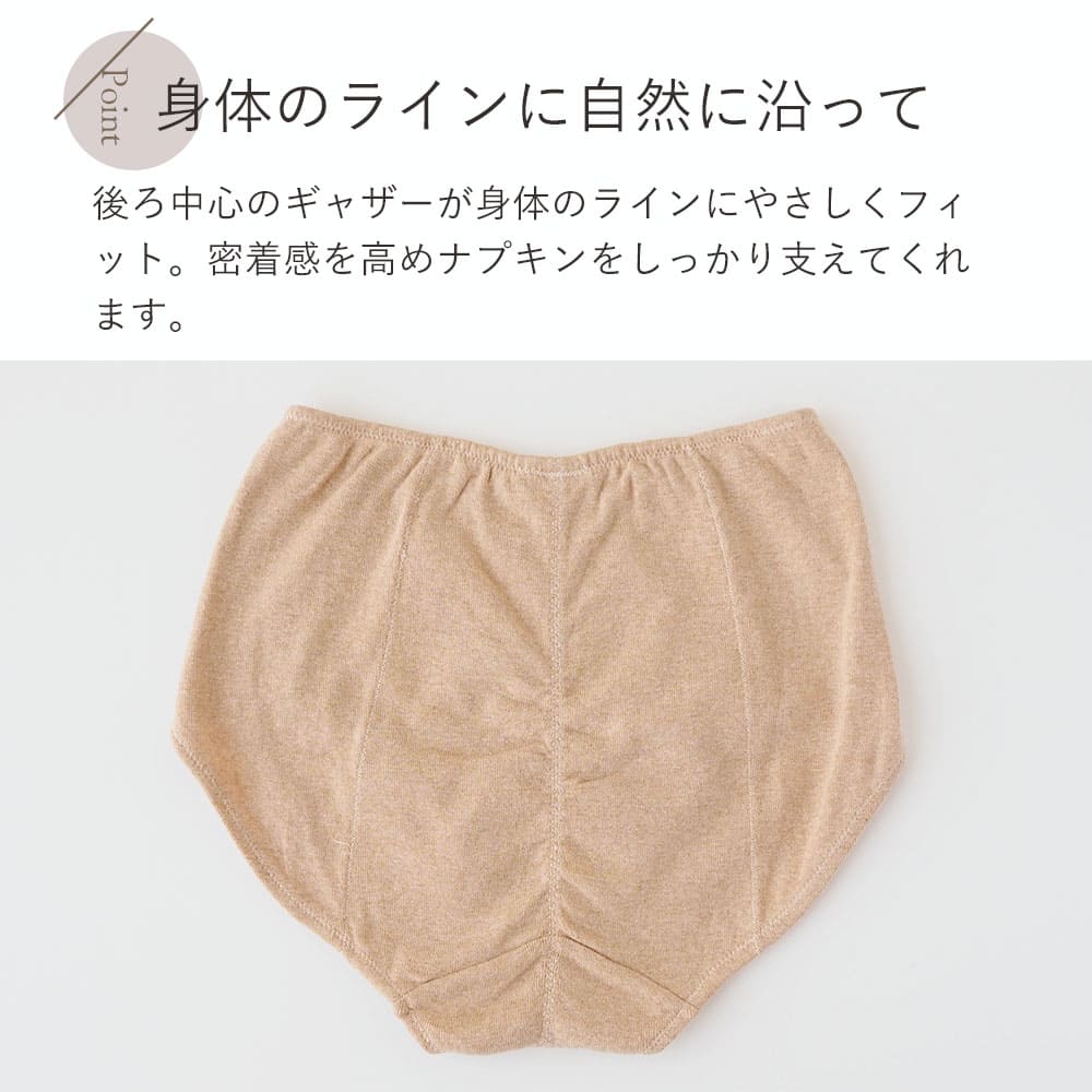 化学繊維に頼らないから身体が快適だと喜んでくれる、普段からも使いたくなる心地よさを実現しました。どんな体調の時でも冷えや不快感から守りおなかとお尻をやさしく包んでくれます。