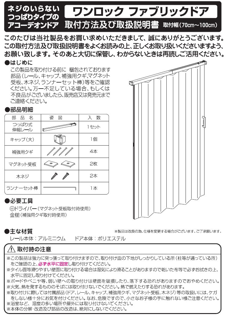 つっぱり式 撥水加工 アコーディオンドア 幅:100cm × 高さ:174cm レールは70〜100cmまで伸縮 扉 間仕切り カーテン