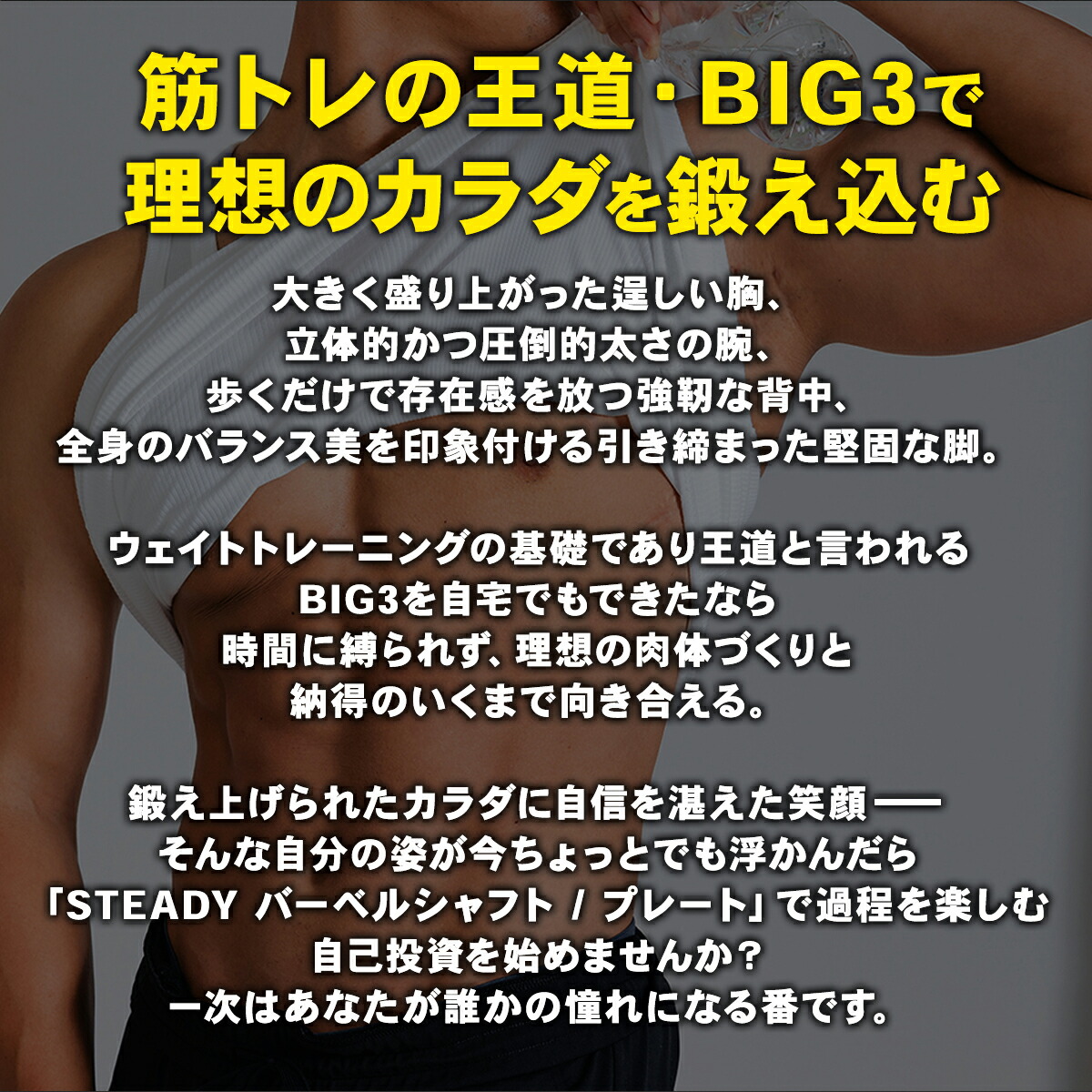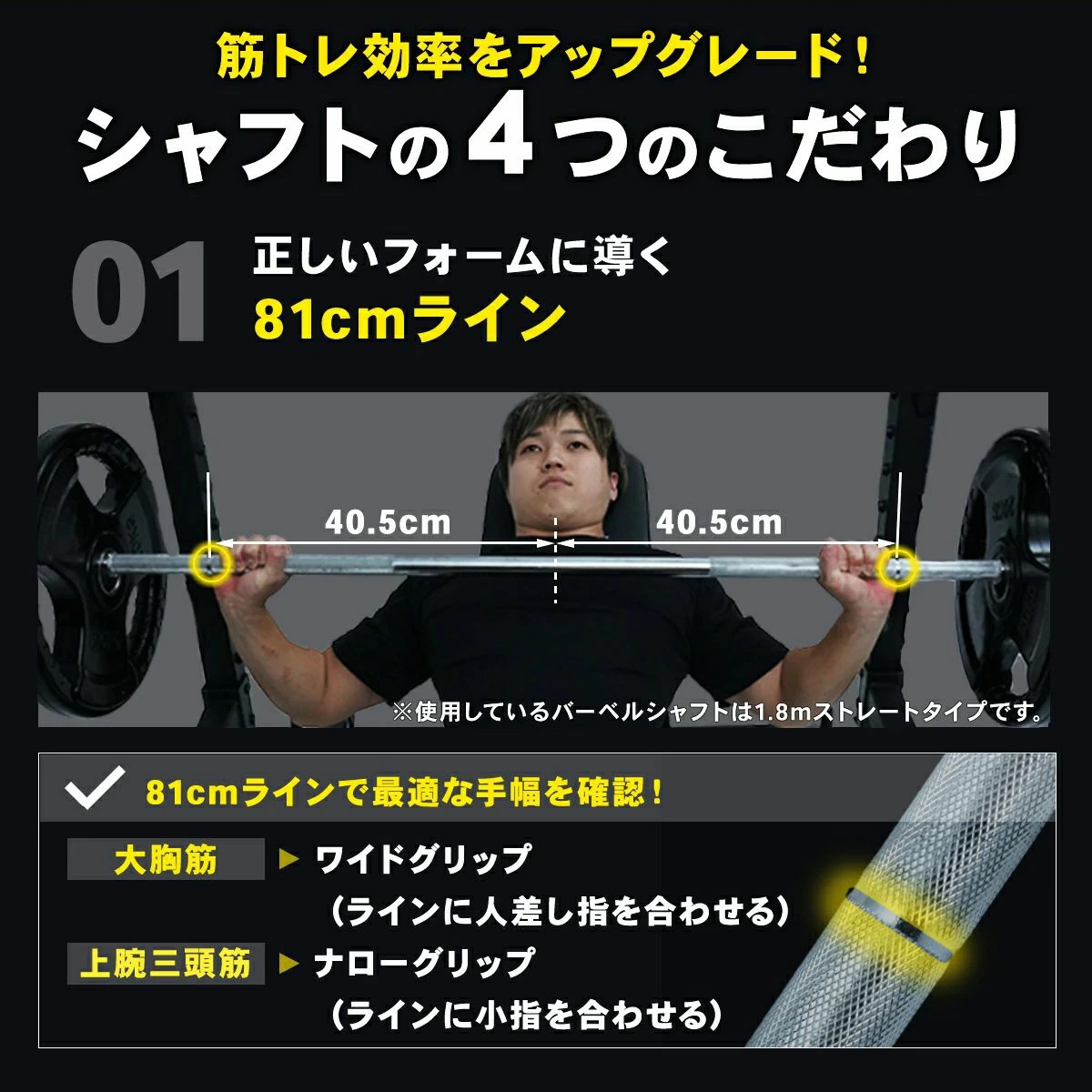バーベルシャフト中央から左右40.5cmの位置にあるグリップ目印ラインにより、初級者でも最適な手幅でバーベルトレーニング、筋トレを行えます。ベンチプレスの場合は、ラインを基準にワイドグリップのポジションを取ることで大胸筋に、ナローグリップでは上腕三頭筋にしっかりと負荷をかけることができます。