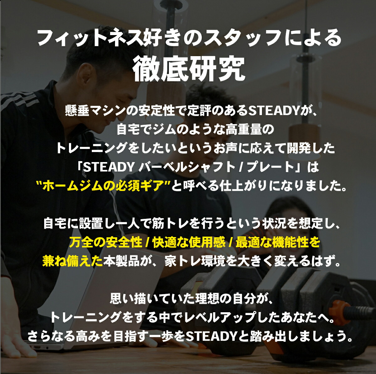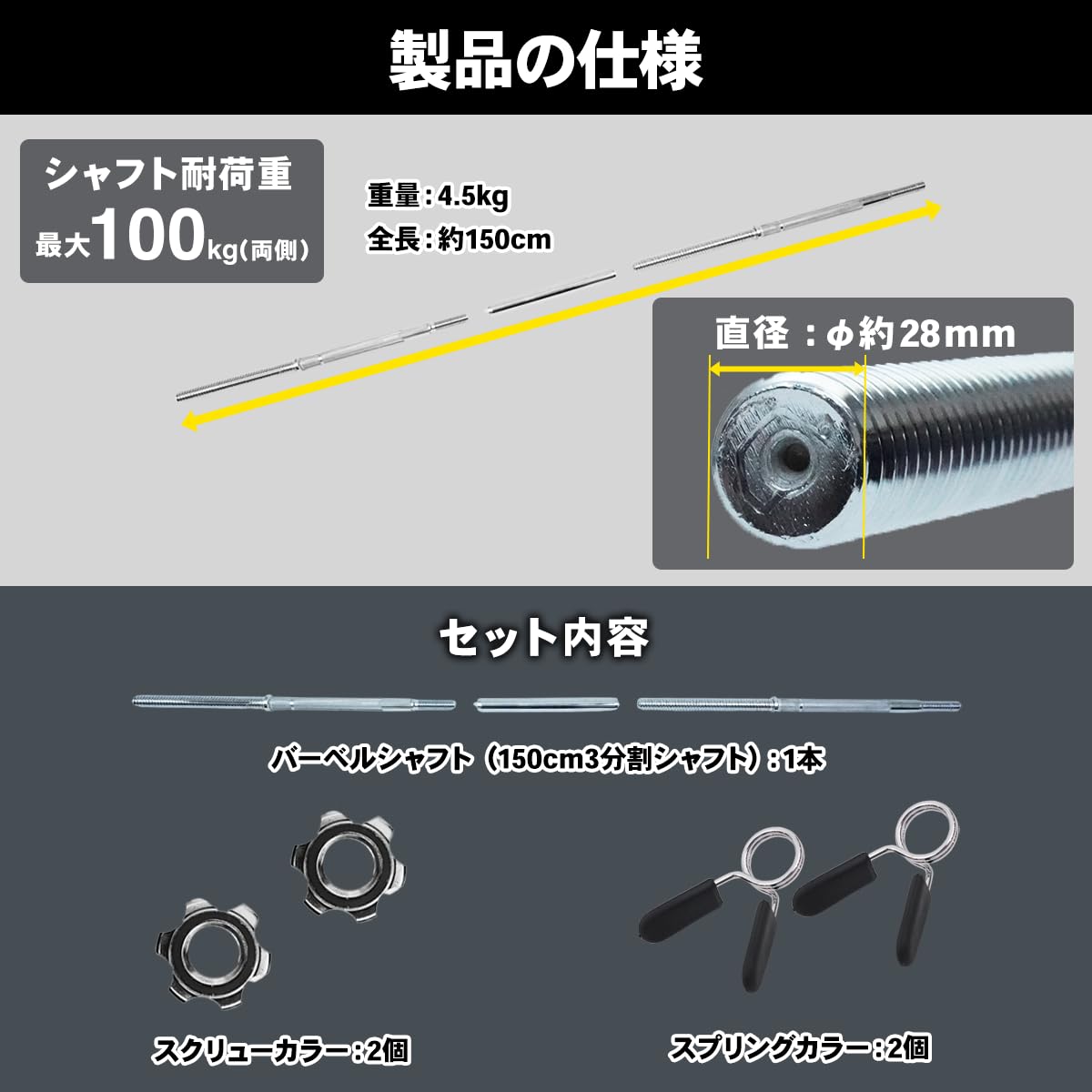 バーベルシャフト両端のスクリューは高い技術力が求められる精密切り出しで造形し、最大136kgの耐荷重を実現。バーベルプレートを固定するカラーは2種類ご用意しており、ラバーリング搭載のスクリューカラーはしっかりとバーベルプレートを固定したい時に、クリップのようなスプリングカラーはベンチプレスやスクワットの際にクイックにバーベルの重量変更やバーベルプレートの取り付け /取り外しをしたい時に便利にお使いになれます。