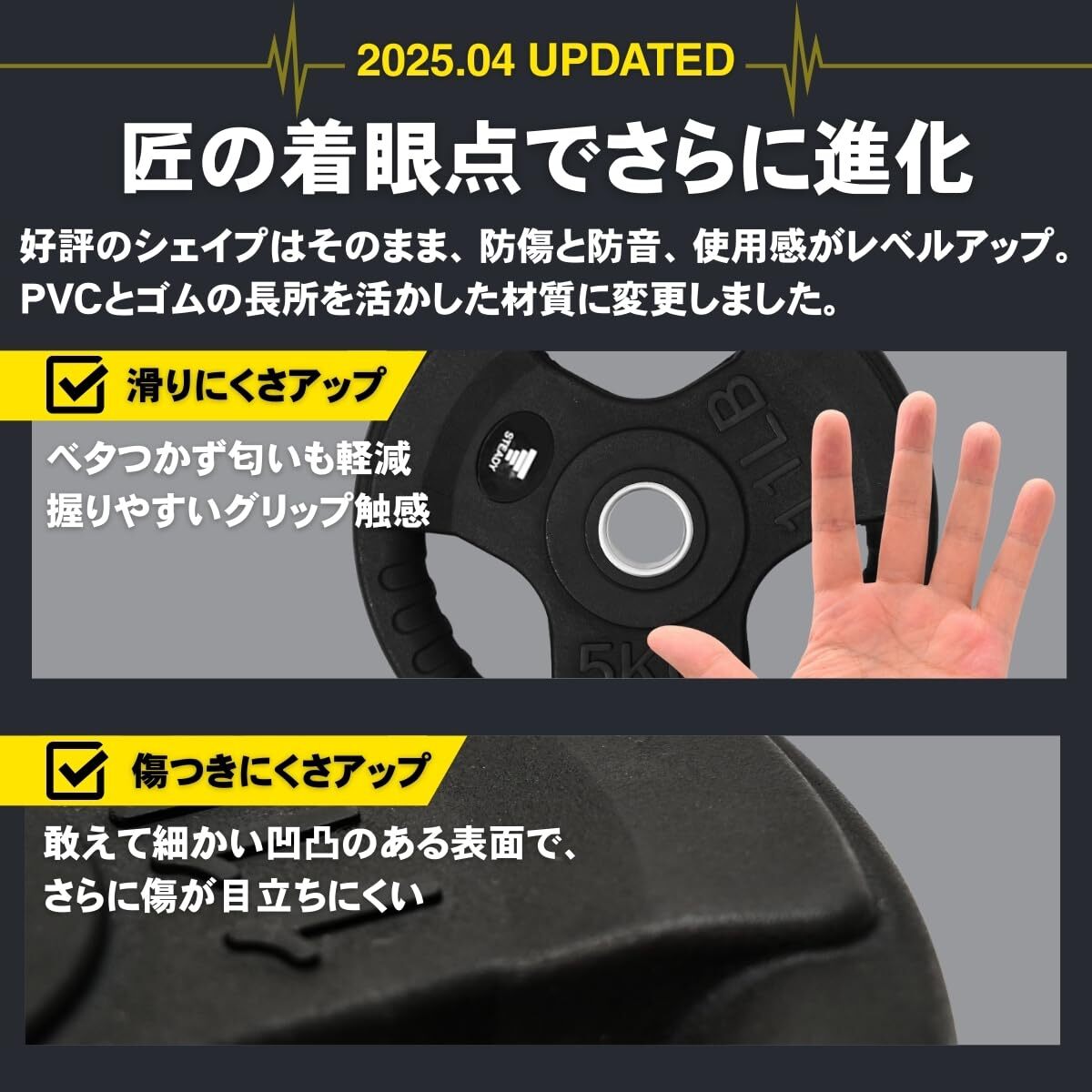 バーベルシャフト表面に上級トレーニーや本格派のジムで最も支持されるダイヤローレット加工を採用。滑りにくく、手のひらへの負担も軽減されるため、狙った部位に的確にアプローチできます。また、グリップの太さはどなたでも握りやすく、多様なプレートに対応する直径28mmを厳選チョイスし、滑りにくさ / 握りやすさ / 手のひらの痛めにくさの三拍子が揃った、上級者も納得の使用感を目指しました。