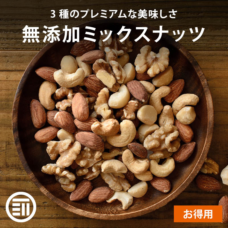 3種のナッツが、それぞれ香ばしくおいしい。 素材本来の香りや甘みを贅沢にお楽しみいただける前田家の「無添加ミックスナッツ」 ぜひ、お選びください。