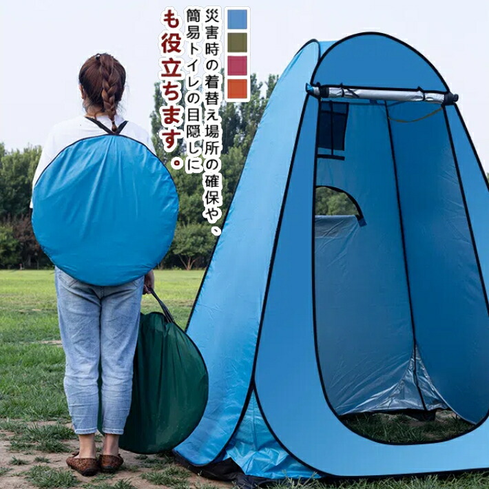 アウトドア、イベント、防災用など着替えスペースを確保する簡易テント。 災害時の着替え場所の確保や、簡易トイレの目隠しにも役立ちます。 ダブルファスナーで内外両側から開閉、タッセルで巻き止めできます。 ポップアップ式テントで、ワンタッチで設置できるので初心者や女性でも簡単に設置できます。 防水生地を使用し、万が一の急な雨にも、慌てることなくお着替え可能です。 内部にはスマホ―などの小物が収納できるポケットも作られます。 側面に小窓を設計して、通気性をしっかり確保しつつ、周囲の様子も観察できます。 タオルや着替え、ペーパーを掛けるループが設置しております。 使用しない時には折りたたんで、遊び先へ持って行くのも、持ち帰るのにも嬉しい仕様です。