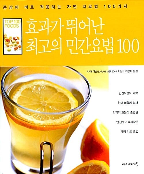 長い時間をかけ慣習的に試みられ、テストされてきた民間療法の中で、現代医学によって医薬的効能が証明された100種類の材料とその自然な治療効果を説明する。 「Top 100 Food」シリーズの中で四番目の本では、信頼できる民間療法を現代人に適用して治療を助け、健康な生活を支援してくれる。