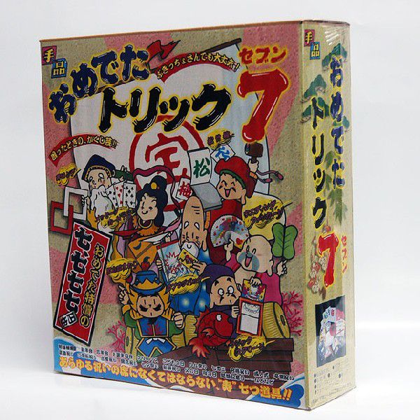 史上初のおめでたいトリックだけを集めた祝賀用マジックセットです。七福神で飾られた「おめでたボックス」に入った内容は、大好評の「紅白皿まわし」(J1117)から、豪華景品が当たる? 心憎い演出の「ラブラブバッグ」(V1211)、白紙の大福帳に松・竹・梅の文字が現れる「松竹梅」(P7921)、ラッキー7のカードがおめでたい5種類のメッセージカードに変化する「メッセージカード777」(C6918)、モノクロのカードが目の前でオールカラーに変化していく(マジシャンからのバースデーカード・未来からのウェディングカード・サンタからのクリスマスカードの3点をセットした)「マジックスクリーン」(C2942他)、1枚の紙をちぎっていくと紅白2つのつながったリングになってしまう「寿リング」(P7711)、最後にラブラブカップルの絵がファンいっぱいに現れる「ウェディングファンカード」(D1135)の7種類!祝いの席になくてはならない「寿」七つ道具です。