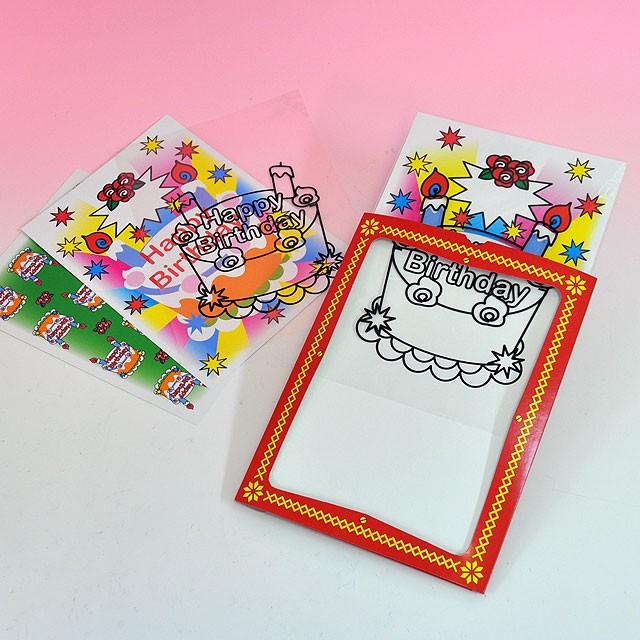 お誕生会にピッタリのマジックです。あなたは「ミスター○○(有名手品師の名前等を言う)から、大きなバースデーカードが届きました。」と言って、赤いフレーム(縦265mm・横205mm)に入ったモノクロのバースデーカードを見せます。そして「おや、バースデーカードにしては、絵がさみしいですね…」と言いながら、フレームからカードを抜き出します。すると、カードはフレームから出てきた部分に順に色が付いていき、ついにカラフルなオールカラーの絵に変わってしまいます。しかも、そこにはお誕生日の人へのお祝いのメッセージや誕生日の日付まで書かれています。(あなたのお好きな内容が書き込めます)カードは、そのままお誕生日の人へプレゼントしてあげましょう。幼稚園・保育園等のお誕生会に利用すれば、お子様の心に残る誕生日になることでしょう。製品のカードは、裏面にもケーキのイラストが入った、とてもかわいい製品です。(カード2組付)<「予備カード」(C2944A)は、ギミック、カード各3枚セットです。合わせてご注文ください>