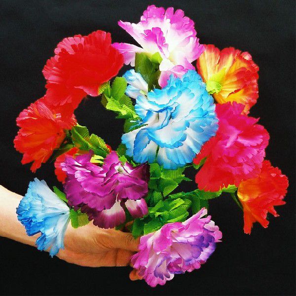 花びらと葉に布を使用した、羽毛の製品より本物らしいと評判の取り出し用花束です。カラフルな12輪を配し、取り出したときは、直径30cm・高さ35cmになるちょっと大きめの製品です。使い方は、例えばこの花束を洋服の内側や袖の中に隠しておいて、大きめのシルクやスカーフ<例えば「バッグトゥスカーフ」(T5415)で袋からスカーフに変えた後にこのスカーフを利用する等々…>の陰からパッと華やかに出現させてみせることができます。花はこれまでの布製の作品同様バランスよく、たいへん美しい出来映えです。上記の方法の他にも、各種のプロダクション用具から取り出したり、まとめた「のべシルク」(S813X他)や「プロダクション 紙テープ」(P110X)の陰から取り出したりと、あなたの演技を華やかに盛り上げてくれます。説明書には、両手を叩くとその瞬間、花束が出現するというオープニングに最適の方法も解説してあります。