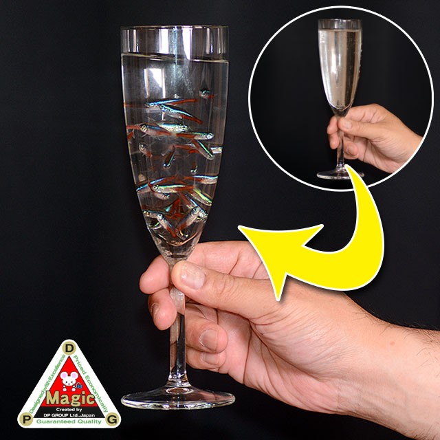 本物のガラスを使用した大型シャンパングラス(高さ約215mm)を使った、やさしくできて鮮やかなトリックです。あなたは水の入ったシャンパングラスをよく見せ、グラスがスッポリかぶさるスカーフ(または大型ハンカチ)で覆います。魔法をかけてスカーフを取ると、突然、泳いでいる魚群が現れます。魚群は熱帯魚の「ネオンテトラ」が美しくてお勧めですが、他にも「グッピー」や、「メダカ」、小さな金魚等でも構いません。やはり本物の生き物を出現させるマジックは効果絶大です。パーティーで、乾杯する時に、あなたはこの演技を披露して、テーブルのセンターにそのまま飾っておく… なんて、おしゃれで心憎い演出でしょう。【マル秘テクニック】グラスのギミックは取り外せます。複数購入し、女の子を家に招き、彼女(達)のグラスだけにシャンパンを注ぎ、乾杯の後に、すかさずこのトリックを演じましょう。 これで、彼女(達)の目はハートマーク!(魚やスカーフは各自ご用意下さい。)<同様の製品に「DPG いきなり魚群(アルティメイト デビルハンカチ付)」(A1007)もございます。>