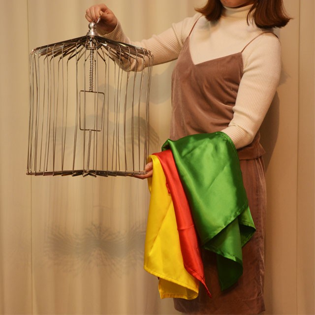 マジシャンは、3枚の異なった色の大型スカーフを1枚ずつ改めてよく見せます。もちろんスカーフには何も怪しいところはありません。ところが、その3枚のスカーフの束から、直径30cm以上、高さ40cmほどの大きな円形の鳥篭が出現します。鳥篭は40本近い支柱に各種のスプリングを組み合わせて作られた精巧なものです。畳むと直径8cm弱の棒状になってしまい、上には取っ手のリングが付いています。また、中に生きた小鳥(カナリヤ、インコ等)を入れた状態で出現させることもできます。これなら、どんな大きなステージでも十分演じられますし、 しかもやさしくて強烈なインパクトがありますから、観客の目に焼き付くようなプロダクションマジックとなることでしょう。用具は特製の鳥篭に3枚の大型スカーフ(約60cm角)、それに特製ギミックのオール一式セットです。スカーフを使ったマジックのクライマックスに…、そしてオープニングに演じても最高に盛り上がるトリックです。