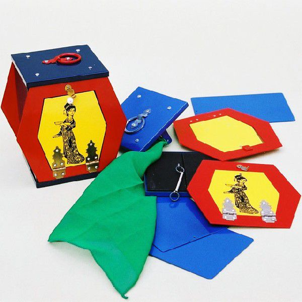 マジシャンは金属製のカラフルに塗装された箱(縦横共11cm・高さ17cm)を示します。そして、前面の扉を開けて中からスカーフを取り出し、箱は上部の取っ手を持ってお客様にぶら下げていてもらいます。そこで、扉を閉めたままスカーフを箱の中に戻してみせると言って、手にしたスカーフを消してしまいます。<演出上、「ぐちゃぐちゃウォンド」(I5611)や「洋風バラバラセンス」(T5711)を併用するとより効果的です>そこで、箱を持ったお客様に扉を開けてもらうと・・・、その瞬間、箱はバラバラに壊れて床に飛び散ります。お客様はただ呆然とたたずむのみ。そして、手には箱の上部だけが残っており、消えたスカーフがぶら下がっているのです。客席は大爆笑となります。お客様の意表を突いたユーモアトリックの傑作と申せましょう。(約30cm角スカーフ2枚付き・写真は用具を2組使用しています)<スカーフのバニッシャー(「DPGハンカチーフボール」(U2001A)・「DPG シルクバニッシャー」(P7051)・「ハンカチーフプル」(I5357)・「チェンジングバッグ」(T5611他)等は別売>