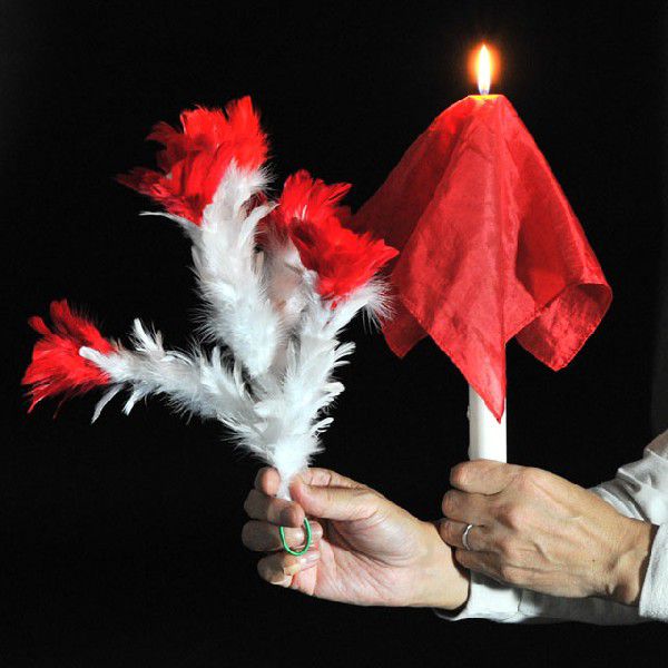 マジシャンは炎が点いたキャンドル(長さ30cm・直径25mm)をよく見せ、シルクを1枚取り出して、火の点いたキャンドルの上からシルクを掛けます。ところが、キャンドルの炎は、シルクを貫通してしまいます。お客様にもシルクの上から炎の部分だけが出ているのがハッキリわかります。さらに、シルクを前後左右にずらしますが、シルクが燃えている様子もありません。最後にシルクを取り去ると、ナント!シルクの中から白い葉の付いた赤い5輪の羽花が出現します。それはあたかも、火の点いたキャンドルから花が分離したかのように…。そして、シルクはまったく無傷のまま、焼け焦げた跡なども一切ありません。炎がシルクを貫通するだけでも驚きなのに、さらに花束まで出現する!やさしく演じられて強烈なインパクトの製品です。また、「ミルクになるキャンドル」(V5695)・各種「バニシングキャンドル」(Q6439他)等、他のキャンドルマジックやシルク、フラワーを使ったマジックとの併用も効果的です。(シルクは別売/ギミックにつけるローソクは各自ご用意ください)