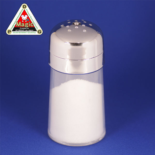 「DPG マジック ソルトシェカー」は塩の瓶(ソルトシェーカー)(約直径 48mm・高さ 100mm)の中の塩(食塩)を消失させたり出現させたりできる用具です。当社考案の画期的メカニズムにより、単に塩の消失だけではなく、塩をまるでMAGIC POWDER(魔法の粉)のように扱えます。カラの手の中に塩を振りかけて塩を品物に変化させる・・・例えば、塩を振りかけるとシルクやボール、タマゴ等に変化し、その品物を使って次のマジックにつなげる等です。塩を消す時は、瓶を上下に振るごく自然の動作なのでイメージしやすく、ごく簡単に演じられます。もちろん、消えた塩を再度出現させることも可能です。更に「DPG マジックソルトシェーカー用 4色食塩セット」(I6383X)を併用し白い食塩をカラー食塩に交換すると、カラフルな魔法の調味料を振りかけ、その色のシルク等に変えるという演出ができます。「DPG マジックソルトシェカー プラス」(I6384)・「DPG マジック ソルトシェーカーセット(用具3点+食塩4色)」(I6386)の欄も覧ください。(組立式)
