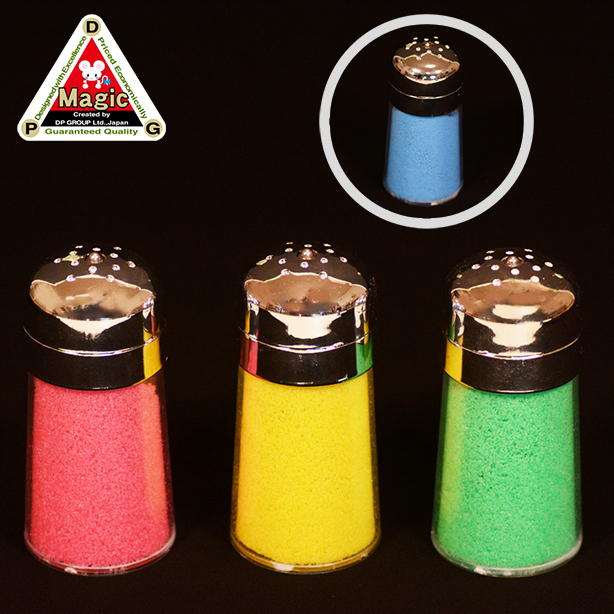 本製品は「DPG マジック ソルトシェーカー」(I6383)を3点。それに「DPG マジックソルトシェーカー用 4色食塩セット」(I6383X)が付属した、とてもお買い得な製品です。まず、これらの製品の欄をご覧下さい。食塩は調味料の代表ですが、最近では赤い唐辛子・黄色いターメリック・緑の山椒等、お店には色鮮やかな調味料が並んでいます。そこで、これらの調味料を模して楽しい演出にしてみませんか。例えば、3色の調味料から、お客様に好きな色を選んでもらいます(フォースではありません)。そして、両手をそれぞれ改めた後、選んでもらった色の調味料(カラーの塩)を手の中で振ると調味料が手の中で、調味料と同じ色のシルク等(別売)に変化してしまいます。さらに例えば、赤・黄・緑の調味料を赤・黄・緑の3枚のシルクに変化させ、それを使って「ネットチューブファンタジー」(N4111)の演技に続ける等も面白い。また、シルクだけでなく「魔法のボール」(U1201)を使って調味料をボールに変化させる等、色々と工夫して一味パンチの効いた味付けのマジックにして下さい!(白い食塩はついていません)