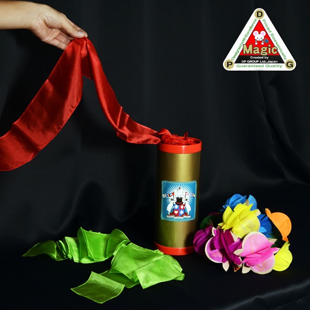 これだけで気軽に本格的なプロダクションマジックを演じられます。本製品の演技の詳しい内容については、「DPG ファントムチューブ(レギュラー)」(I7560)をご覧ください。この製品は「DPG ファントムチューブ(レギュラー)」に取出用品として「楠玉(雅)」(P5231)と「特上のべシルク Sサイズ 約10 x 460 cm」(S811X等)を2色・2枚(色は2色で製品によって異なります)をセットにして数量限定で販売するたいへんお買い得なセットとなります(所定の数量に達した段階で販売終了となります)。更に「特上 ミニチュア万国旗」(S5112)や「デザインシルク「グッバイ」(特上品 Mサイズ)約90 x 56cm」(S8411)等を追加していただくと一層豪華になります。なお、類似の製品でお値段がお安い製品として、やはり取出用品付の「PRD.チューブ 動物ランド(楠玉付)」(K6337)・「PRD.チューブ 富士と桜(桜吹雪付)」(K6340)・「PRD.チューブ デビル(ジャグリングスカーフ付)」(K6343)がございます。それぞれの欄もお読み下さい。(組立式)