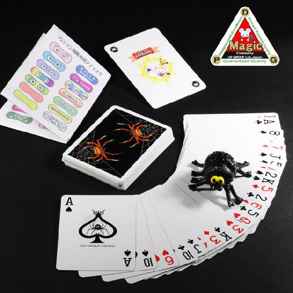 カード当てのトリックとして、その不思議度、ユーモア度とも抜群の超傑作テーブルマジックです。バックデザインが蜘蛛の模様のトランプ(デック)とゼンマイ仕掛けの蜘蛛を使います。マジシャンはお客様にトランプの両面を見せて普通のトランプなのを示した後、1枚のカードを選んでもらい、元に戻して混ぜます。このデックを2つの山(パケット)に分け、お客様の選んだカードが入っていると思われるパケットをよく切り混ぜてから、全部のカードを裏向けに並べます。ここで、ゼンマイ仕掛けの蜘蛛を取り出し、「これは私が長年調教したマジシャン蜘蛛です。」と言って、お客様にネジを巻いてもらい、並べたトランプの上に置いてもらいます。すると、蜘蛛は向きを変えながら、よちよちと歩いていき、1枚のカードの上で止まります。(この間、あなたが蜘蛛やカードに手を触れることは全くありません)そして、蜘蛛が止まったカードを開けると何とお客様が選んだカードなのです!蜘蛛、トランプ、更に笑いのとれる蜘蛛の大きな目をカバーする目隠しシールが付いています。