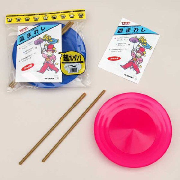 「皿まわし」(J1111)をよりやさしくできるように開発された、初心者のための色鮮やかな入門用のお皿です。「皿まわし」はやさしいとは言っても、やはり、それなりの練習が必要です。これから「皿まわし」にチャレンジしようとお考えの方、買ったけれどもできないとあきらめていた方、まず、このお皿でお試し下さい。直径24cmのプラスチック製ですから、軽く、落としても割れにくくなっています。更に、底の中央の窪みと糸じりをグッと深くしてあり、皿が落ちてこないよう工夫されています。これで、まわし方のコツをつかめばバッチリオーケー! また、付属のスティックは30cmのものを2本ジョイントでつないで使用する携帯便利なタイプです。更に、必ずできる新方式の練習方法やお皿を何枚も並べて回す方法等々をより詳しく解説したテキストも魅力です。(ご注文の際、皿の色の指定はできません・写真は用具を2組使用しています)