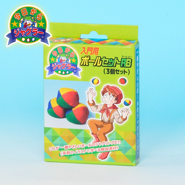 すてきな新パッケージになった、ジャグリングの基本中の基本、「ボールセット」(J1135他)のもっとも手軽な入門用です。表面は4色のネット布地を縫い合わせたカラフルな作りで、中に米を詰めることで理想的なビーンバッグタイプになっています。これなら練習中にいくら落としても、バウンドしたり、転がってどこかに行ってしまうといった苦労はありません。ボールはお米の詰め方次第で重さをコントロールすることができますが、基本的には1個が100g前後にするのが良いでしょう。直径は約 60 mmとお子様でも扱いやすいサイズです。「スカーフセット」(J1121)のカスケードを卒業したら、次はこの「入門用ボールセット」で本格的なジャグリングの門をたたいてください。付属のテキストは、ステップバイステップで基礎練習のやり方から少しずつ着実にマスターしていけるよう、多数のイラストを使って18ページに渡ってわかりやすく丁寧に解説してあります。また、各種の色々な応用の投げ方も覚えることができます。(ボール3個セット)(お米は各自ご用意ください/一部裁縫)
