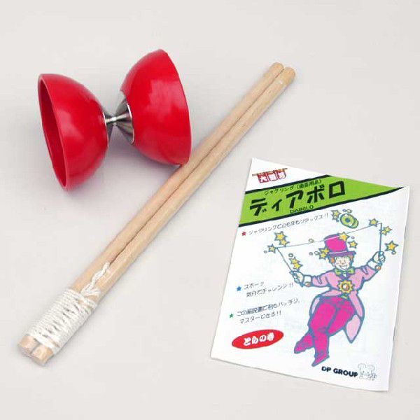 「ディアボロ」は、長さ40cmほどある2本の棒(ハンドスティック)の間に付いたヒモ(長さ150cm前後)の上で大型のヨーヨーのような本体(ディアボロ)を巧みに操ることにより、ヒモに乗せた「ディアボロ」をまわしたり、投げ上げたりと、色々なテクニックが楽しめるダイナミックなアイテムです。元来は中国で生まれた曲技ですが、今日では世界中のジャグラーによって演じられている、最もポピュラーなジャグリングの1つとなっています。本体は、直径10cm・幅11cmの標準タイプで材質には軟質のプラスチックを使い、適度な弾力を持たせてありますから、危険度も少なく、大きさ、重さとも、バランスの取れた製品です。また、操り方の基本はもちろん、「空中への投げ上げ」・「ヒモを登る」・「ジェットコースター」等々、色々な応用テクニックを多数のイラスト入りで解説したテキストブック付きですから、初級者から上級者までどなたにもご満足いただけます。<直径12cm・幅13.5cmの「ディアボロ(L)」(J1197)もございます>(動画はLサイズで実演しております。)
