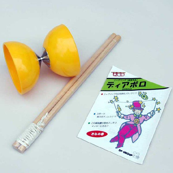 中国で生まれた曲技で、長さ40cmほどの2本の棒(ハンドスティック)の間に付いたヒモ(長さ150cm前後)の上で大型のヨーヨーのような本体(ディアボロ)を操るジャグリングです。ヒモの上に乗せた「ディアボロ」をまわしたり、投げ上げたり、その他色々なテクニックが楽しめます。ここにご紹介するのは「ディアボロ(M)」(J1195)より一層迫力のある演技が楽しめる大型サイズで、本体の大きさが、直径12cm・幅13.5cmもあるプロフェッショナルな用具です。材質は軟質のプラスチックを使用していますから、弾力もあり、危険性も少ない優れた製品です。中には多くのイラストで、基本的な操作方法から「投げ上げ」や「ヒモを登る」等、色々な応用テクニックまでをわかりやすく解説したテキストブック(18ページ)も付いていますし、Mサイズと比べても扱い方に難しさはありませんので、初めての方でも安心してご利用いただけます。